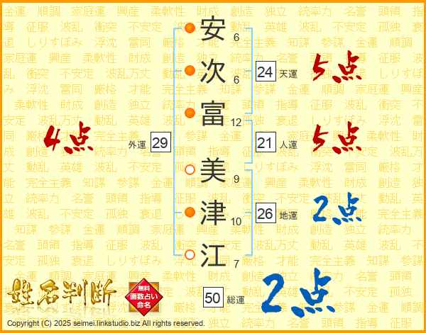 安(6画)次(6画)富(12画) 美(9画)津(10画)江(7画)