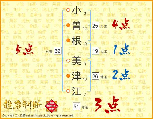 小(3画)曽(12画)根(10画) 美(9画)津(10画)江(7画)