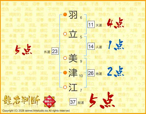 羽(6画)立(5画) 美(9画)津(10画)江(7画)