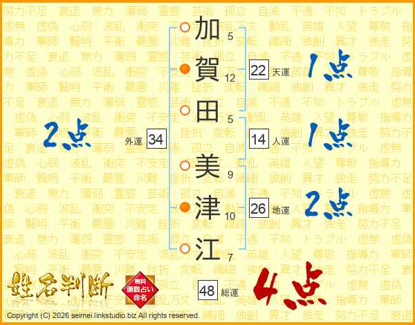 加(5画)賀(12画)田(5画) 美(9画)津(10画)江(7画)