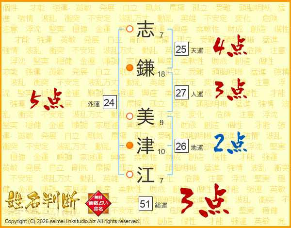 志(7画)鎌(18画) 美(9画)津(10画)江(7画)