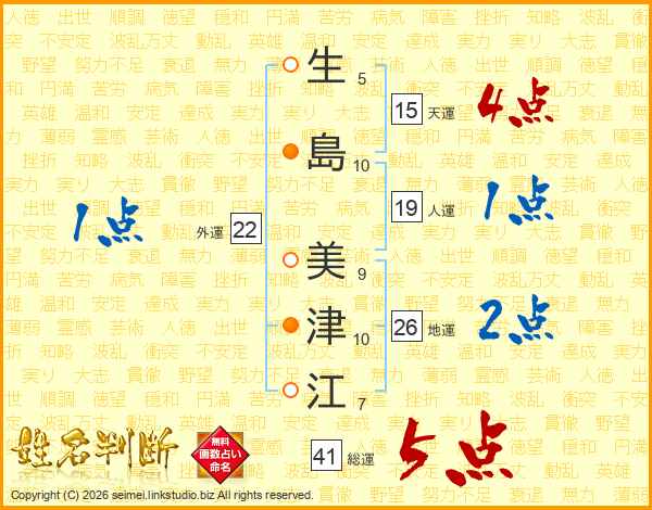 生(5画)島(10画) 美(9画)津(10画)江(7画)