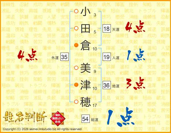 小(3画)田(5画)倉(10画) 美(9画)津(10画)穂(17画)