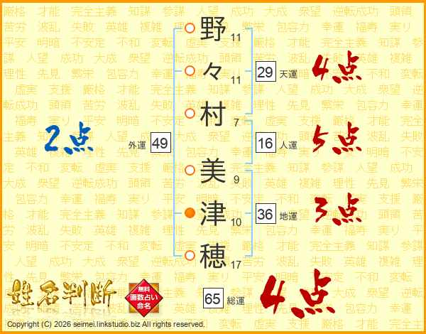 野々村美津穂さんの総運は65画の4点!