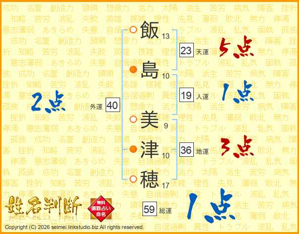 飯(13画)島(10画) 美(9画)津(10画)穂(17画)
