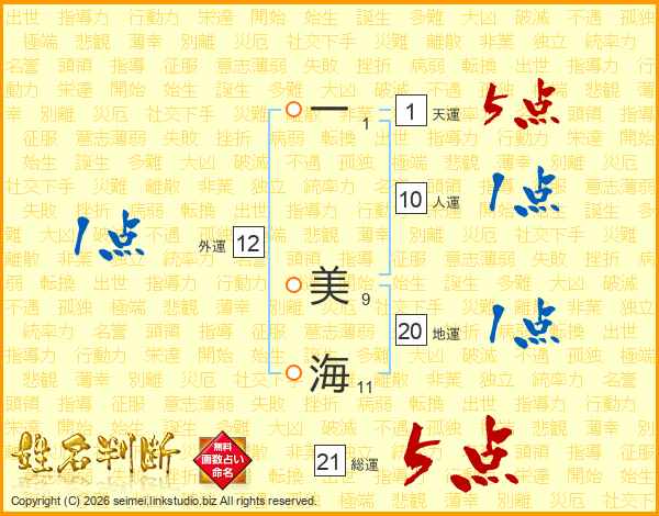 生活面を象徴する運勢です。外部から受ける影響力を表し、結婚運、家庭運や職場、環境への順応性を表します。総運から人運を引いた画数。姓や名が1文字の場合を除く。