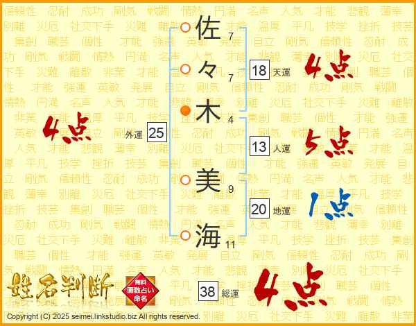 佐(7画)々(7画)木(4画) 美(9画)海(11画)