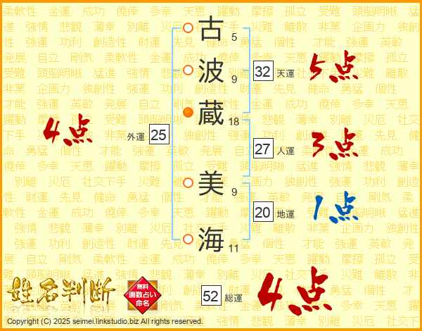 古(5画)波(9画)蔵(18画) 美(9画)海(11画)
