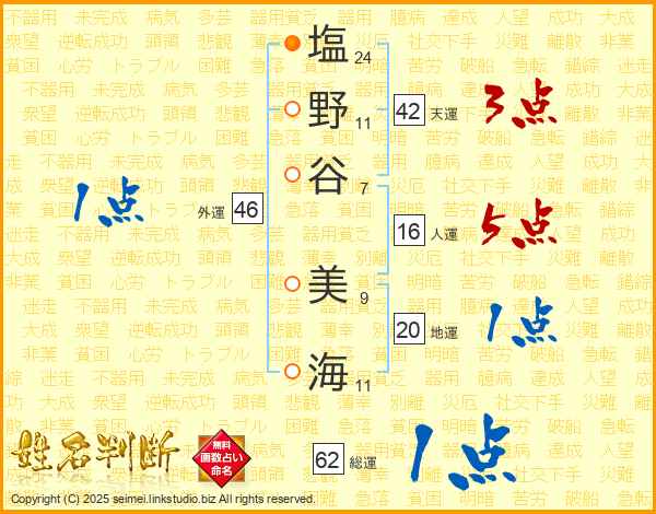 塩(24画)野(11画)谷(7画) 美(9画)海(11画)