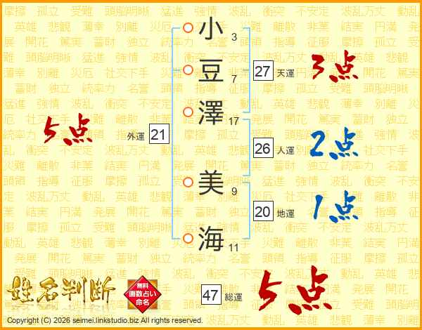 小(3画)豆(7画)澤(17画) 美(9画)海(11画)