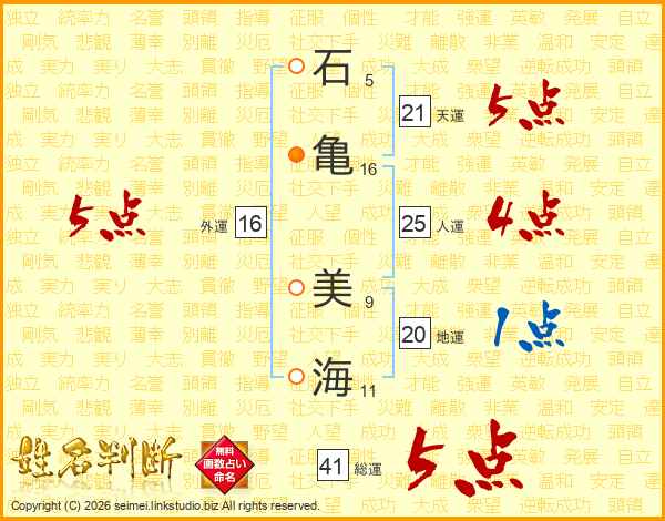 生活面を象徴する運勢です。外部から受ける影響力を表し、結婚運、家庭運や職場、環境への順応性を表します。総運から人運を引いた画数。姓や名が1文字の場合を除く。