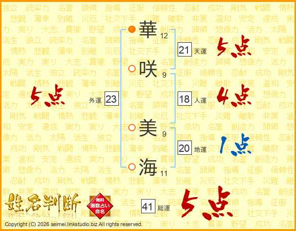 生活面を象徴する運勢です。外部から受ける影響力を表し、結婚運、家庭運や職場、環境への順応性を表します。総運から人運を引いた画数。姓や名が1文字の場合を除く。