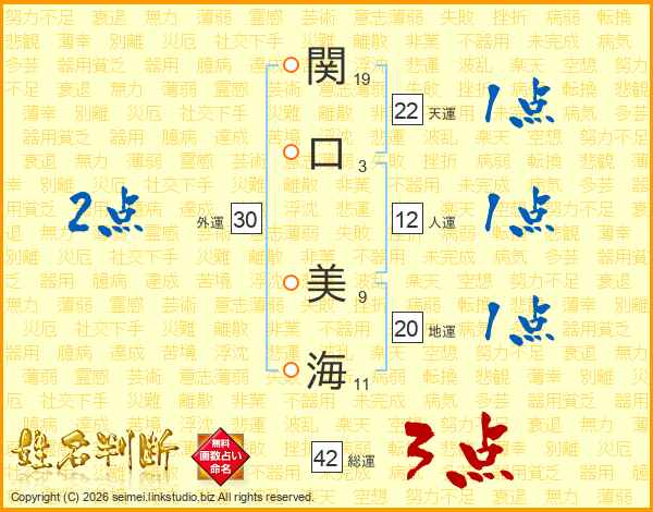 生活面を象徴する運勢です。外部から受ける影響力を表し、結婚運、家庭運や職場、環境への順応性を表します。総運から人運を引いた画数。姓や名が1文字の場合を除く。