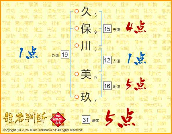 久(3画)保(9画)川(3画) 美(9画)玖(7画)