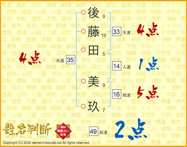 後(9画)藤(19画)田(5画) 美(9画)玖(7画)
