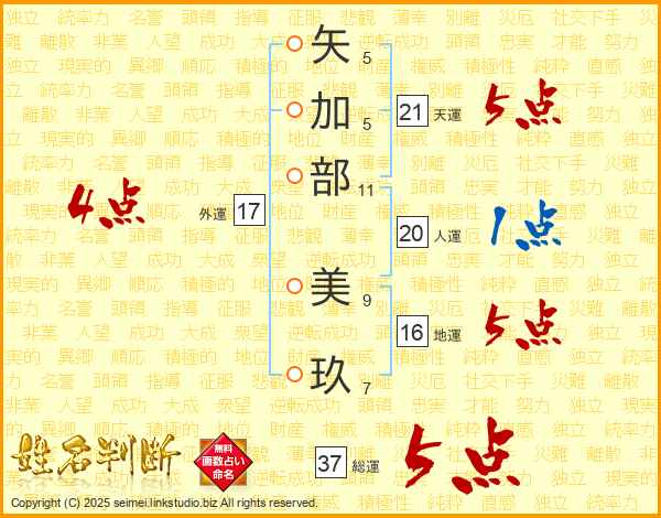 矢(5画)加(5画)部(11画) 美(9画)玖(7画)