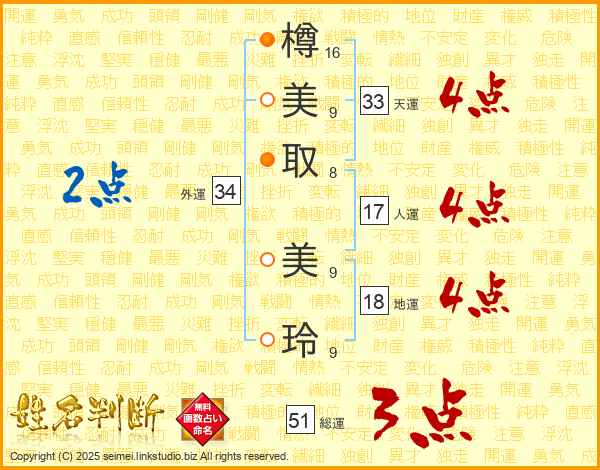 樽(16画)美(9画)取(8画) 美(9画)玲(9画)