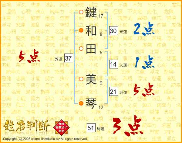 鍵(17画)和(8画)田(5画) 美(9画)琴(12画)