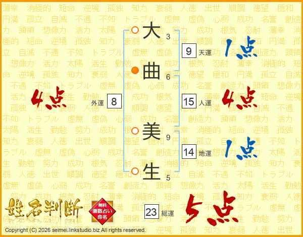 生活面を象徴する運勢です。外部から受ける影響力を表し、結婚運、家庭運や職場、環境への順応性を表します。総運から人運を引いた画数。姓や名が1文字の場合を除く。