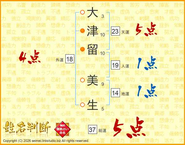 大(3画)津(10画)留(10画) 美(9画)生(5画)
