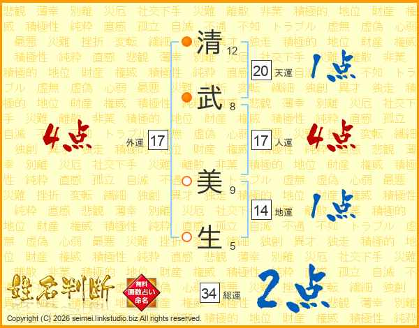 生活面を象徴する運勢です。外部から受ける影響力を表し、結婚運、家庭運や職場、環境への順応性を表します。総運から人運を引いた画数。姓や名が1文字の場合を除く。