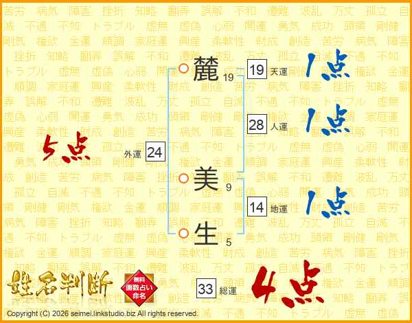 生活面を象徴する運勢です。外部から受ける影響力を表し、結婚運、家庭運や職場、環境への順応性を表します。総運から人運を引いた画数。姓や名が1文字の場合を除く。