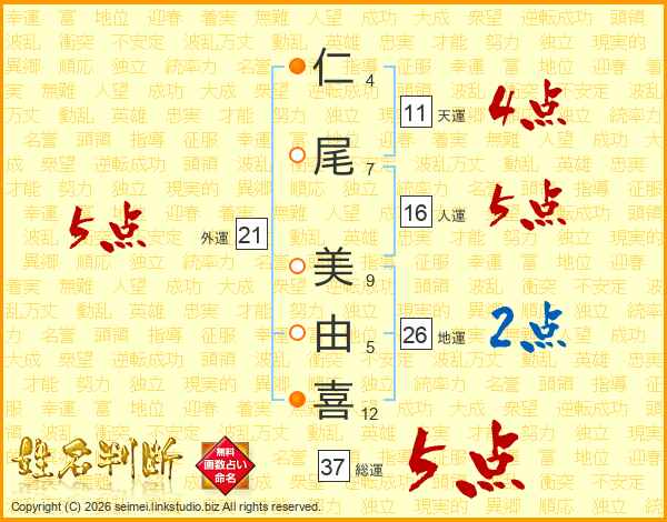 仁(4画)尾(7画) 美(9画)由(5画)喜(12画)
