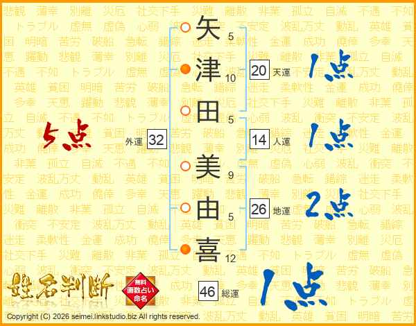 矢(5画)津(10画)田(5画) 美(9画)由(5画)喜(12画)