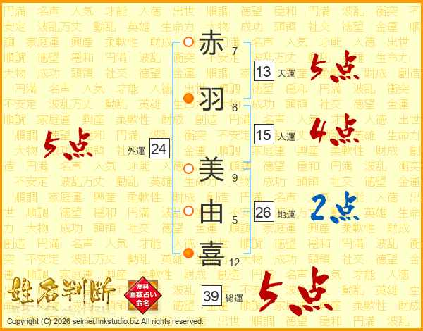 赤(7画)羽(6画) 美(9画)由(5画)喜(12画)
