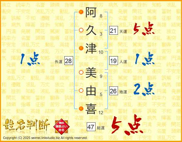阿(8画)久(3画)津(10画) 美(9画)由(5画)喜(12画)