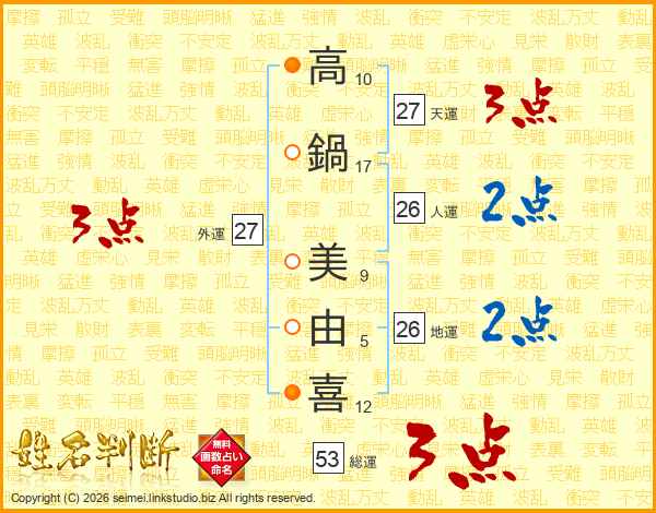 高(10画)鍋(17画) 美(9画)由(5画)喜(12画)