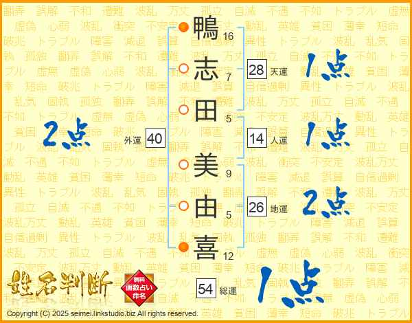 鴨(16画)志(7画)田(5画) 美(9画)由(5画)喜(12画)