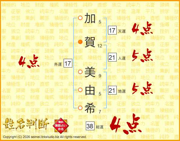 加(5画)賀(12画) 美(9画)由(5画)希(7画)