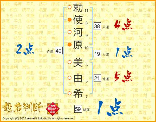 勅(11画)使(8画)河(9画)原(10画) 美(9画)由(5画)希(7画)