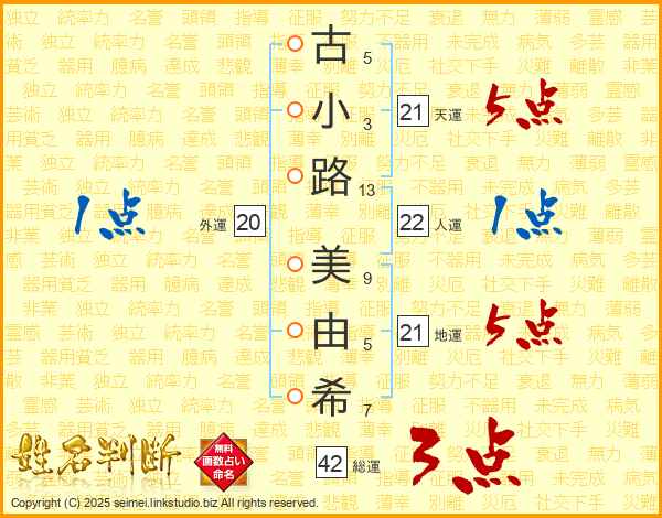 古(5画)小(3画)路(13画) 美(9画)由(5画)希(7画)