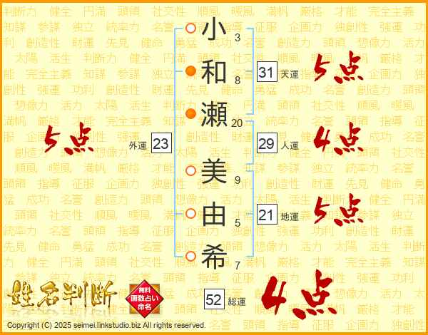 小(3画)和(8画)瀬(20画)  美(9画)由(5画)希(7画)