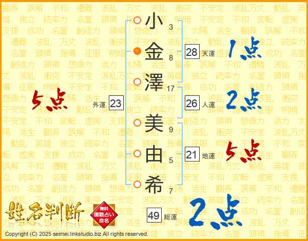 小(3画)金(8画)澤(17画) 美(9画)由(5画)希(7画)