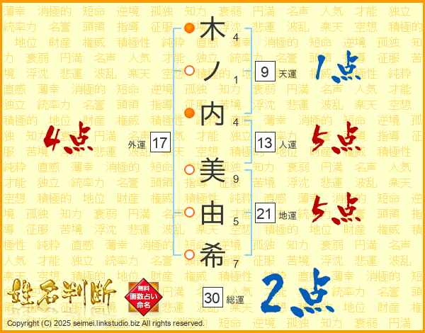 木(4画)ノ(1画)内(4画) 美(9画)由(5画)希(7画)