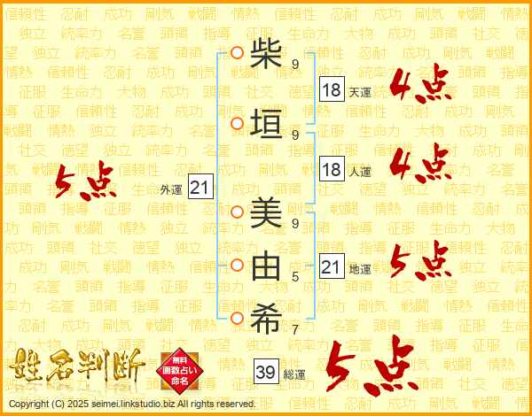 柴(9画)垣(9画) 美(9画)由(5画)希(7画)