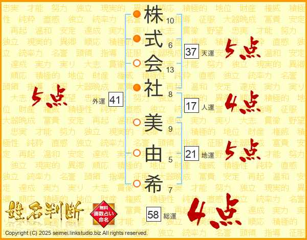 株式会社美由希さんの天運は37画の5点!