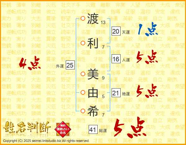 渡(13画)利(7画) 美(9画)由(5画)希(7画)