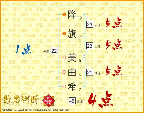 降(10画)旗(14画) 美(9画)由(5画)希(7画)