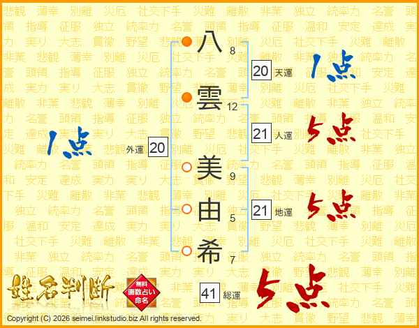 八(8画)雲(12画) 美(9画)由(5画)希(7画)