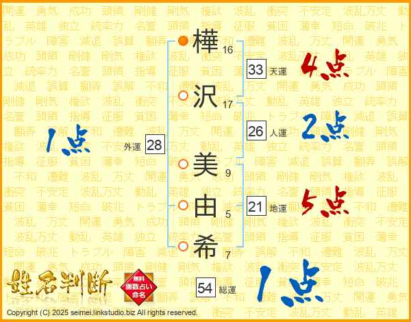 樺(16画)沢(17画)  美(9画)由(5画)希(7画)