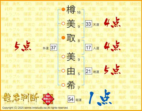 樽(16画)美(9画)取(8画) 美(9画)由(5画)希(7画)