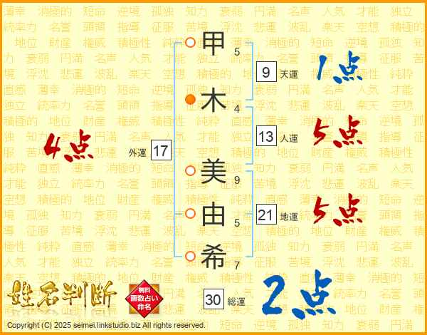 甲(5画)木(4画) 美(9画)由(5画)希(7画)