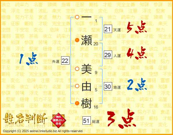 一(1画)瀬(20画) 美(9画)由(5画)樹(16画)