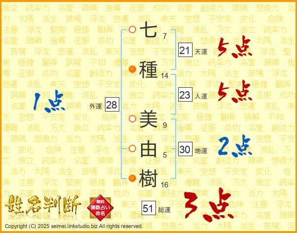 七(7画)種(14画) 美(9画)由(5画)樹(16画)