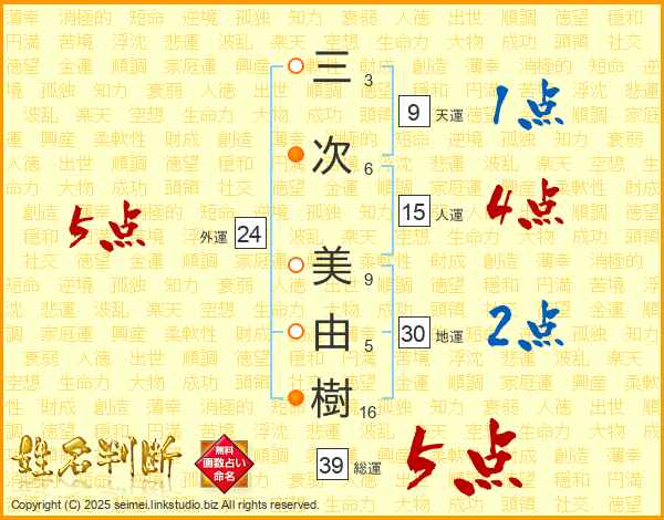 三(3画)次(6画) 美(9画)由(5画)樹(16画)