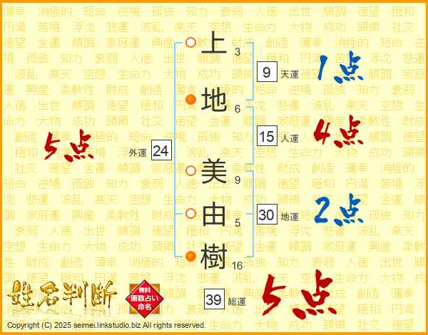 上(3画)地(6画) 美(9画)由(5画)樹(16画)